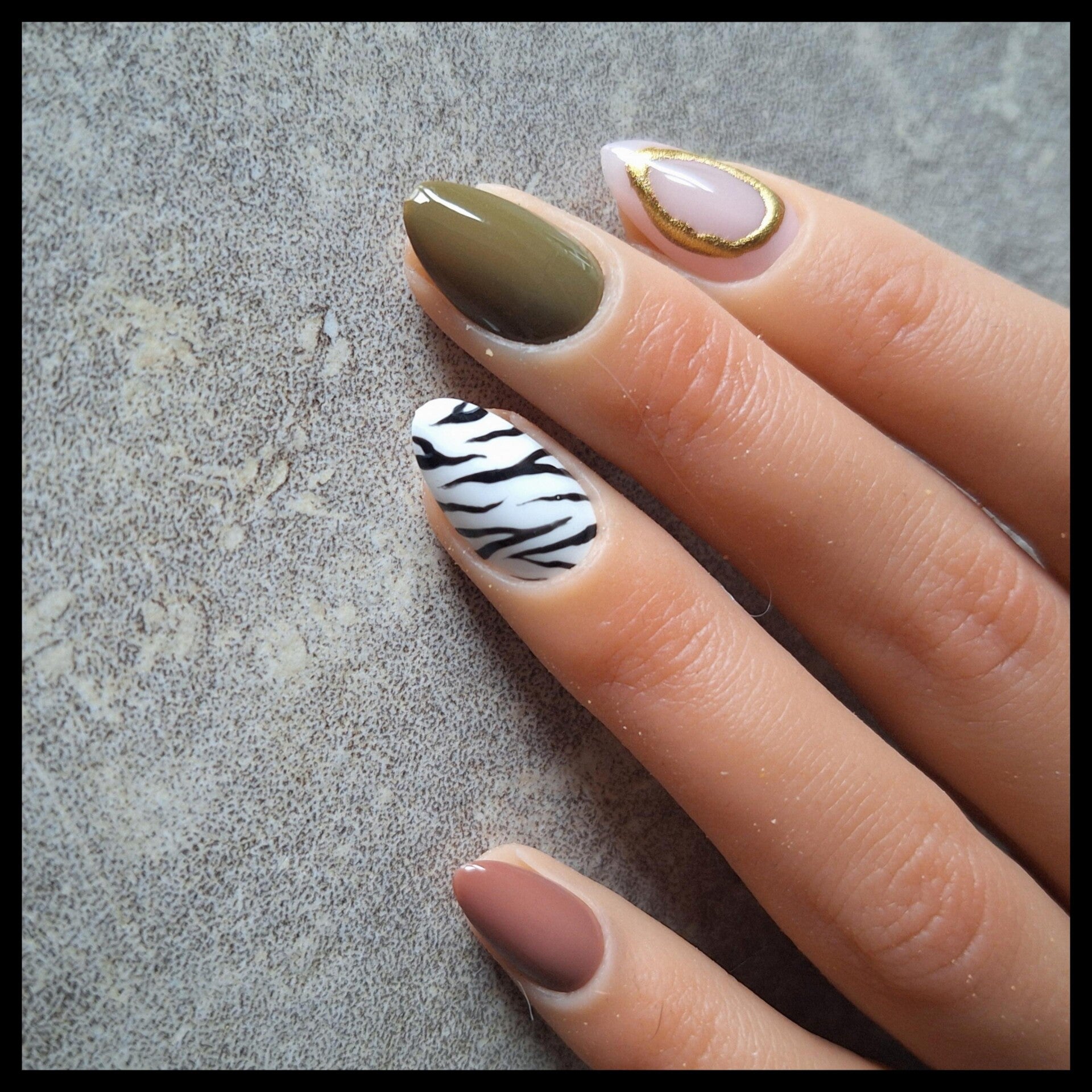 Safari nagels. Bruin, groen, zebraprint en nude/goude circel.